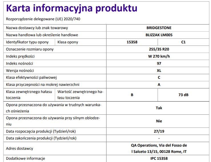 3 720,00 złKompletne koło zimowe ze stopu aluminium prawe w rozmiarze 20 cali z oponą Bridgestone BLIZZAK LM005 w rozmiarze 255/35 R20 97W XL.